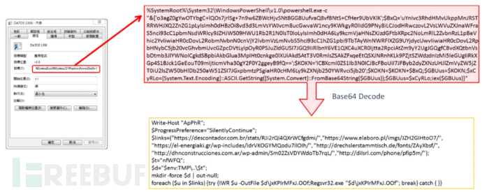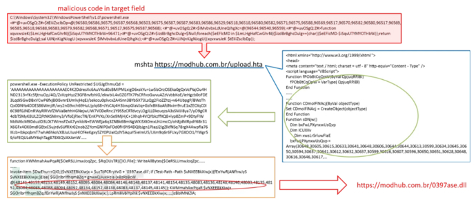 如下所示,样本在目标字段中包含一个 PowerShell 代码片段。PowerShell 代码将 base64 字符串转换为包含多个 URL 的脚本代码。接着就通过每个 URL 下载恶意软件,并通过 Regsvr-32.exe 执行。