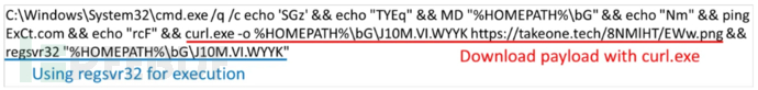 样本调用名为 URLDownloadToFileA的 API 从多个不同的 URL 下载恶意软件,而实际的 Payload 是 DLL 文件并且通过 regsvr-32.exe 来执行。