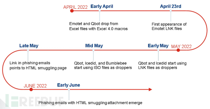 结论文中提到的 Dropper 被多个恶意软件家族所使用,如下所示。四月初,攻击者只使用 Excel 文件进行攻击。紧接着,四月二十三日捕获了 Emotet 首次使用 LNK 文件进行攻击的样本,随后的五月又被 Qbot 与 Icedid 快速采用。五月中旬又出现了 ISO 文件的 Dropper,涉及的恶意软件家族包括 Qbot、Icedid 和 Bumblebee 等。在五月下旬开始,在野出现了 HTML 走私攻击,这样避免了通过网络直接传递恶意软件。