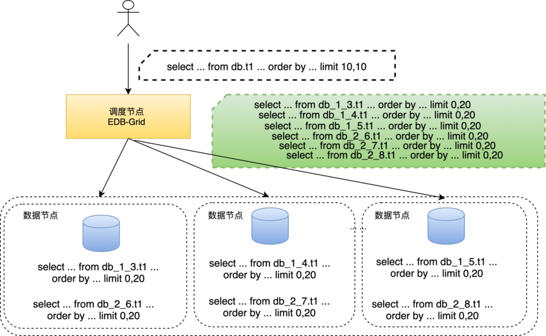 举个例子,如下图所示,这是个排序分页SQL,通过优化原则将SQL进行必要的改写,然后将改写后的SQL并行下发到相关的数据节点执行,最后将数据节点返回的结果集归并再limit,得到最终结果集返回给应用。