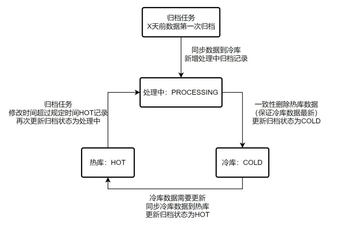 热库归档表的所有唯一键必须跟要归档的热库表保持一致。热库归档记录已存在的订单,冷库必须有相应数据,冷库插入: 先 insert 冷库成功后 再 insert 热库归档表冷库更新:更新冷库数据,使用同一个事务 先 delete 再 insert 冷库数据热库删除:删除热库数据时使用冷库数据当 where 条件,所有热库字段(包含 ID)条件都满足后才能删除成功。数据更新一致性: