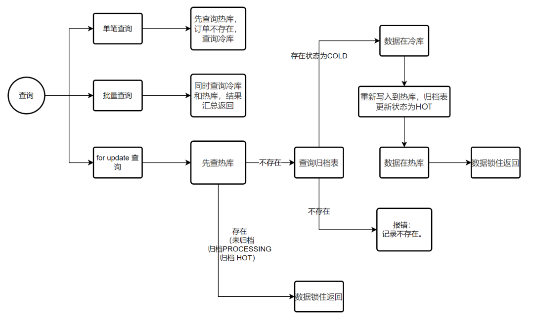 单笔查询:查询热库数据不存在时,不存在再次查询冷库(如果单号中可以判断订单日期,可再增加一层日期过滤,减少冷库查询)批量查询:冷库热库数据都存在时优先返回热库数据。批量查询:合并冷热库数据后,需看原先查询的接口顺序是否有要求,如果对顺序有要求合并后还需排序。减少冷库压力:冷库性能较低,线上实时交易尽可能减少对冷库的查询和依赖(可通过交易单号中的日期或者归档表进行过滤)。限制天数控制:数据库交互 层天数控制 为 n,归档任务控制的天数为 m,要求 m>n。例如,mode 层 有些判断订单超过 n 天的才会查询冷库,归档任务只归档 m 天前的历史数据,分开控制可以防止因调整归档天数导致数据查不到情况。具体细节