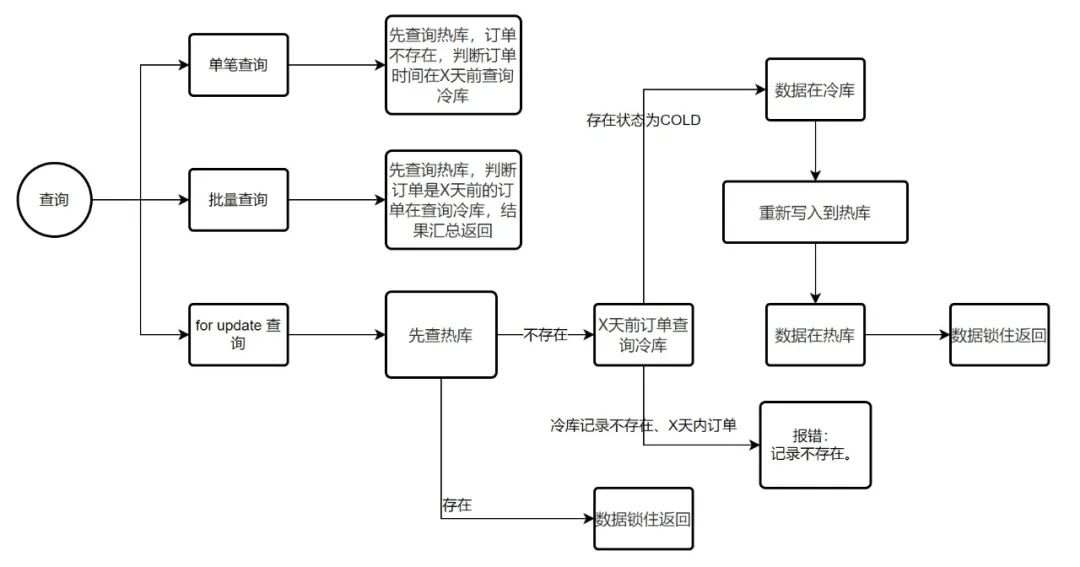 单笔查询:根据外部单号查询,如果查询的 qps 较高,可以查询冷库前使用归档表进行过滤判断。根据交易单号查询,如果可以根据单号判断时间,查询冷库前使用单号进行时间范围过滤。批量查询:部分功能管理后台功能分页查询,对数据查询范围要求较高的增加冷库查询逻辑时,可以增加传入的查询时间范围的开始时间过滤是否需要查询冷库,针对冷库热库都存在情况时优先保留热库数据(只过滤同一分页内的相同单号数据),如果对结果有异议可使用单号单独再次查询返回最新再次确认。跟产品和运营确认能不支持的就仅查询热库。更新