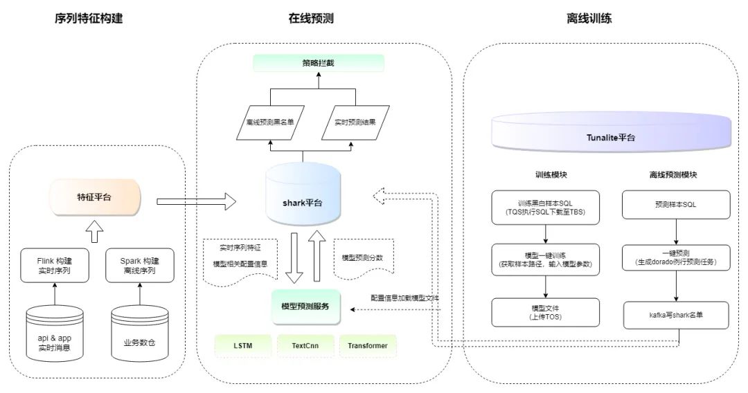 特征构建:通过特征平台构建 Flink 实时序列及 spark 离线序列作为线上序列数据的输入离线训练:TunaLite 平台 SQL 化输入训练黑白样本且自定义选择特征处理函数、模型选型及模型参数进行一键离线训练,训练完成模型文件上传至 TOS。在线预测:shark 决策中心调用预测服务并传入模型、特征相关参数后返回模型预测结果。除了以上实时预测链路,提供了例行离线预测链路。方式为 SQL 化输入例行预测样本,自动生成 Dorado 例行预测任务,将预测结果通过 kafka 写入线上名单进行拦截。当业务场景调用 QPS 过大时可使用该方式进行模型落地。