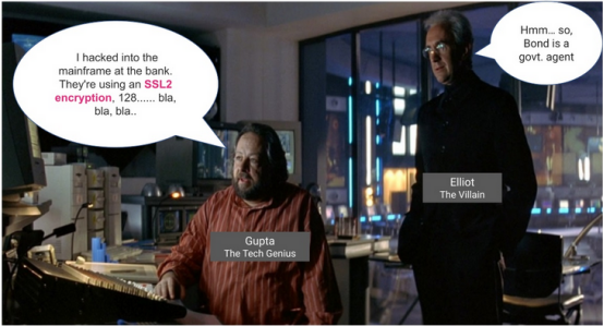 安全套接字层(SSL)的第一个版本是由网景(Netscape)公司在1994年开发的;最流行的版本是版本2和创建于1995年的版本3。它非常受欢迎,甚至被拍进了007系列电影中(下图是1997年上映的《明日帝国》)。