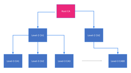 Root CA证书链创建证书颁发机构层次结构是为了分配颁发证书的工作负载。可以存在从不同级别的不同证书颁发机构(CA)颁发证书的实体。在证书颁发机构(CA)的多级层次结构(如父级和子级)中,顶端有一个证书颁发机构(CA),称为Root CA参阅下图)。每个证书颁发机构(CA)还将拥有由父同证书颁发机构(CA)颁发的证书,Root CA将拥有自签名证书。