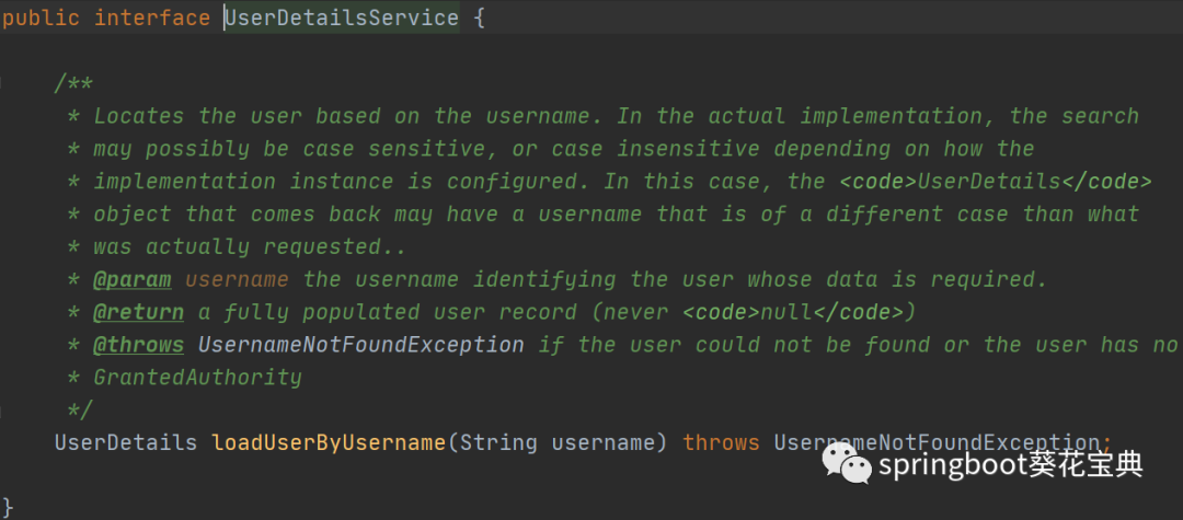 }1.2.3.4.5.6.7. UserDetailsService的实现我们需要自定义个UserDetailsService接口的实现类CustomUserDetailsService,用于实现UserDetailsService接口中的loadUserByUsername方法,通过该方法定义获取用户信息的逻辑。