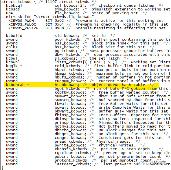 上面是11.1.0.7版本的Oracle的kcbwds结构,黄色部分就是我说的object queue hash table。在没有这个hash table的时候,如果要把某个drop/truncate的对象相关的cache清理出去的时候,就需要遍历shared_buffers,这样情况下,缓冲区越大性能就越差。如果有了这个hash table,那么这个操作的性能就只与该对象在缓冲区中的缓冲块的数量有关了。