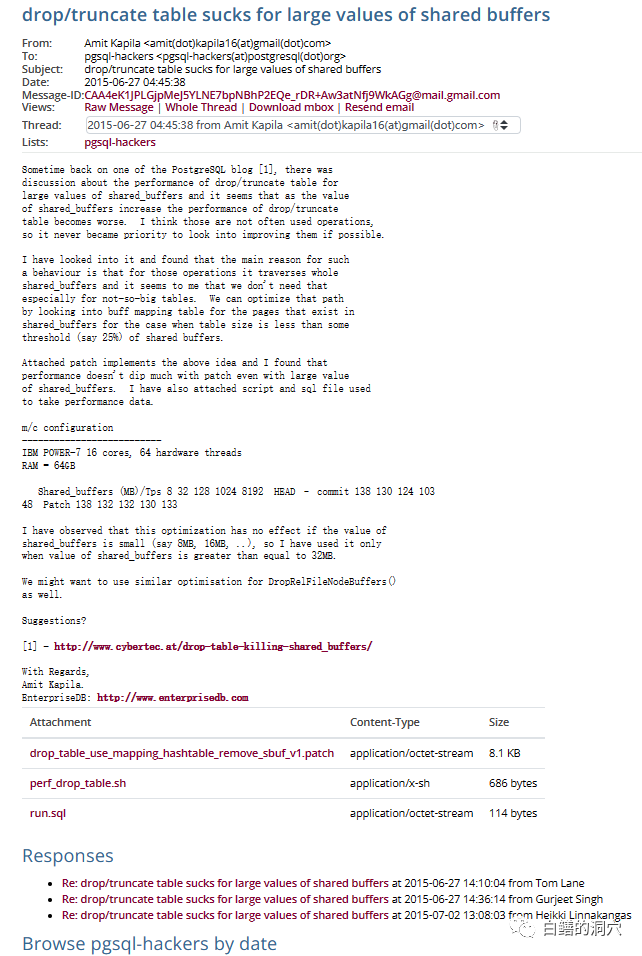 实际上,对于这个问题,2015年的时候,就有人写了Patch,只不过当时PG社区的大多数大佬认为超大内存数据库系统只是小众场景,频繁做drop/truncate的系统也不多,因此没必要在这方面做优化。