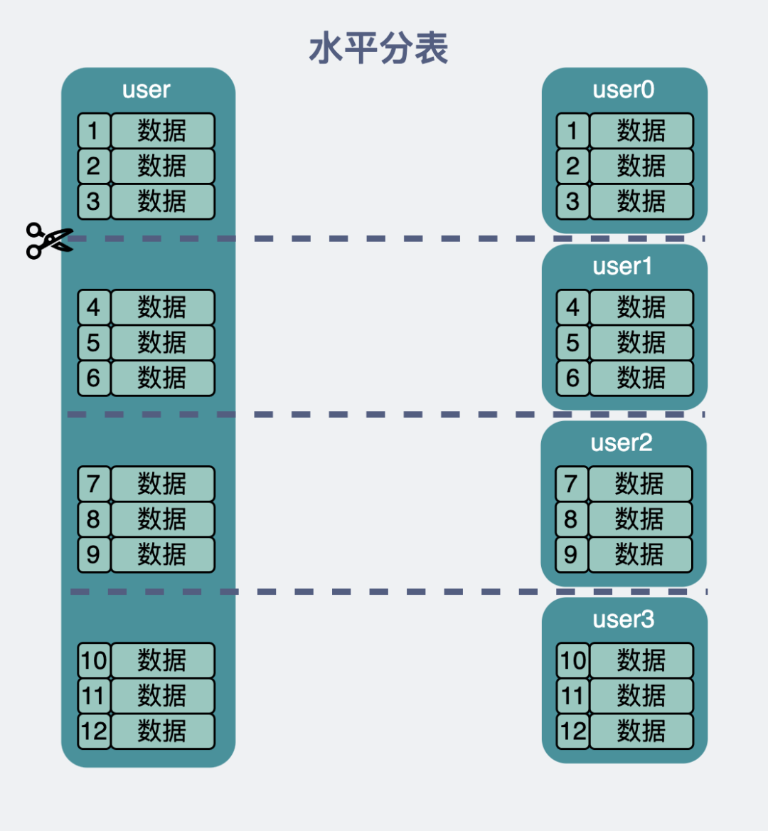 水平分表有好几种做法,但不管是哪种,本质上都是将原来的 user 表,变成 user_0, user1, user2 .... uerN这样的N多张小表。