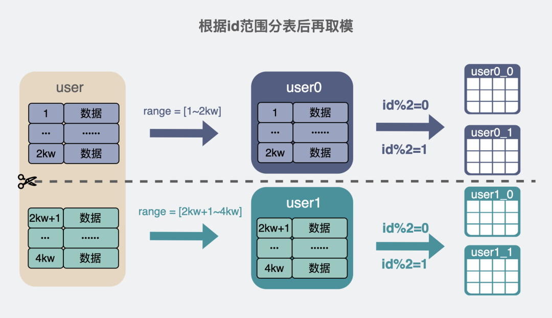 我们可以在某个id范围里,引入取模的功能。比如 以前 2kw~4kw是user1表,现在可以在这个范围再分成5个表,也就是引入user1-0, user1-2到user1-4,在这5个表里取模。