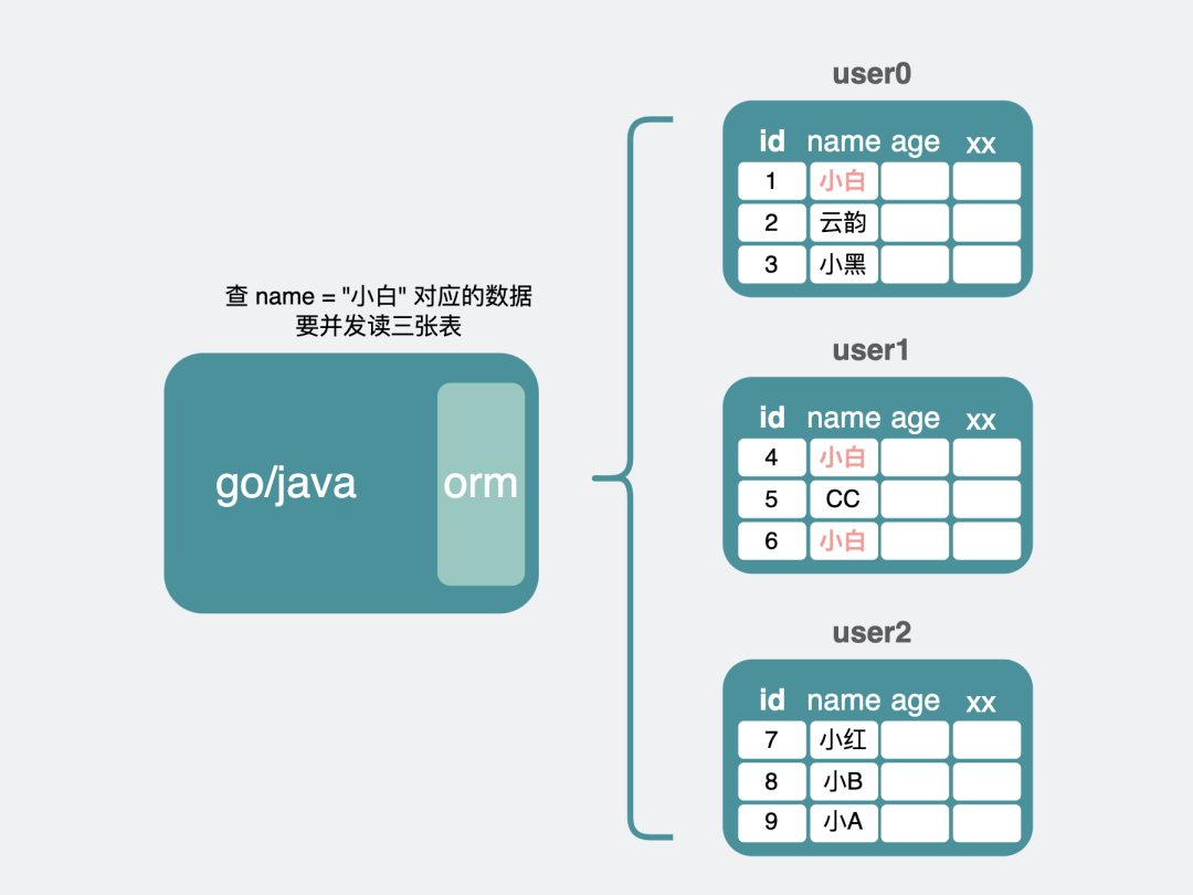 当我们执行 select * from user where name = "小白"; 则需要并发查3张表,随着表变多,查询次数会变得更多。