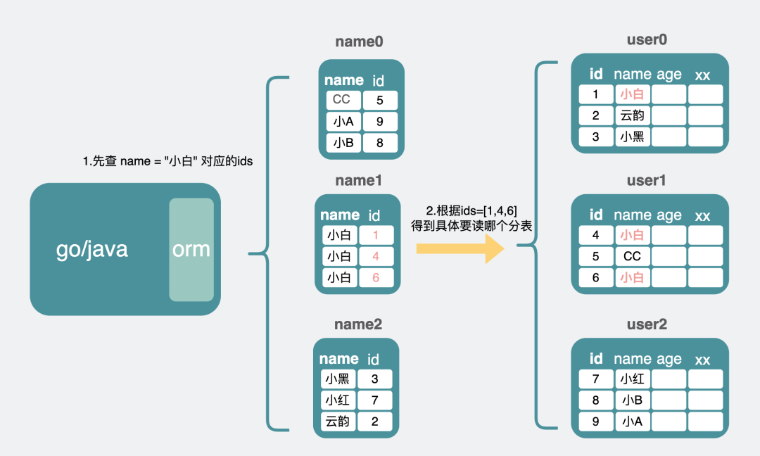 再拿着结果里的ids去查询 select * from user where id in (ids); 这样就算表变多了,也可以迅速定位到某几张具体的表,减少了查询次数。