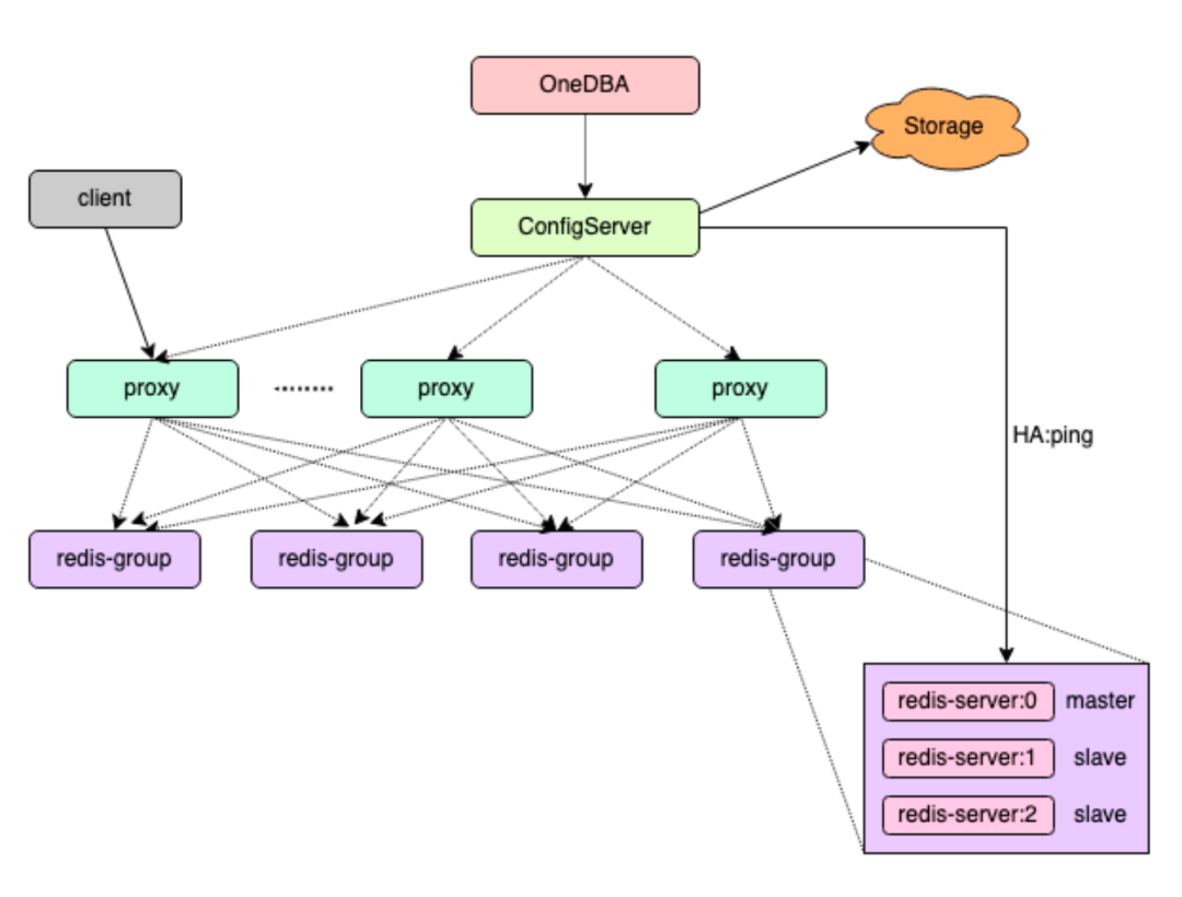 自建 Redis 分布式 KV 缓存系统由 ConfigServer、Redis-Proxy、Redis-Server 等核心组件构成,整体架构图如下所示:
