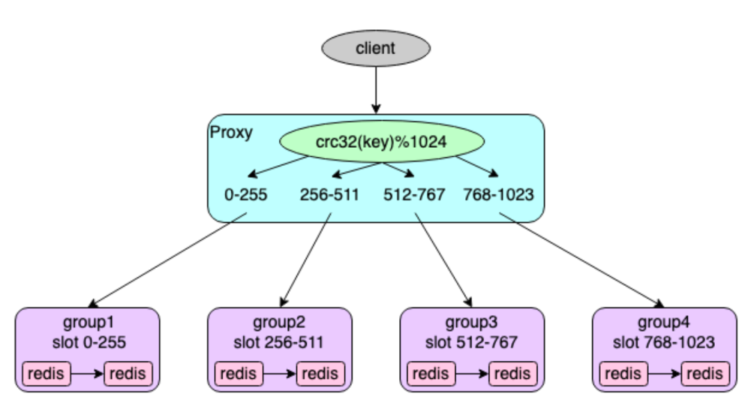 在自建 Redis 中,每个集群可能包含多个 Group,每个 Group 对应一组主从 Redis-Server 节点,每个 Group 负责一部分 Key,同时,整个集群划分为 1024 个槽(slot),每个 Group 负责其中一部分槽(slot),用户写入的 Key 通过以下算法来计算对应的 slot,然后存储到对应节点。