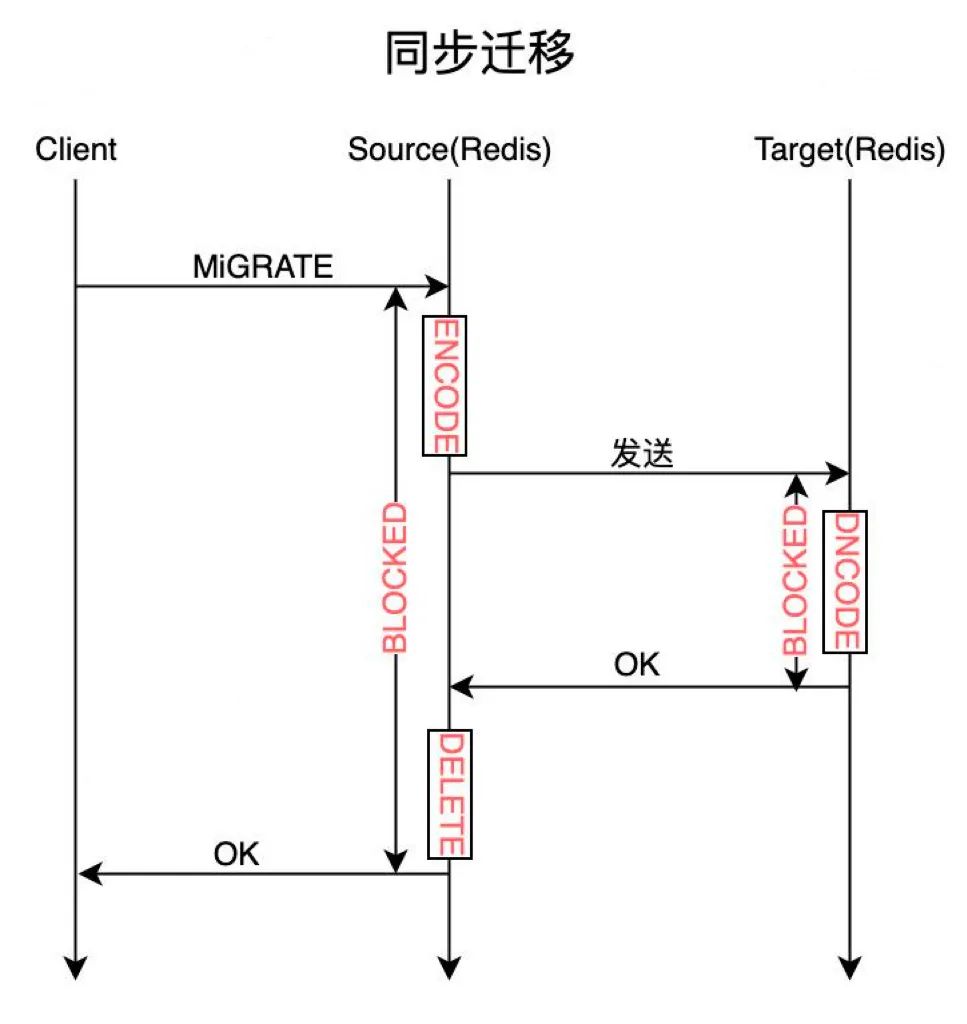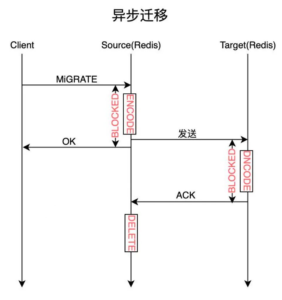 同步迁移:即在上述整个迁移过程中,源端的 Migrate 命令处于阻塞状态,直到目标端成功加载数据,并且返回成功,源节点删除该 Key 后,Migrate 命令才响应客户端成功。由于 Redis 数据操作是一个单线程模型,所有命令的处理的都在主线程中处理,因此 Migrate 命令会极大地影响其他正常业务的访问。