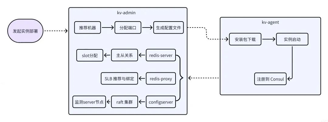 负责完成实例部署时任务调度、机器推荐、端口分配、SLB 推荐与绑定。实例列表展示、实例基本信息查询。数据离线分析与保存。资源池管理及生成资源报表。Kv-Agent每个 ECS 上会部署一个 Kv-Agent 组件,Kv-Agent 负责完成实例部署、实例启停等操作;基于心跳元数据的 Exporter 自动注册与解除;