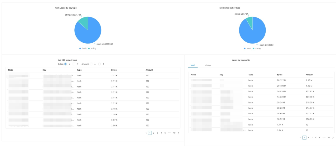 RDB 离线分析:运维平台支持生成 RDB 文件,并自动进行数据离线分析。分析结果包含 Top100 Value 最大的 Key 和元素个数最多的 Key;每种类型 Key,不同 Key 前缀包含的 Key 数量等。