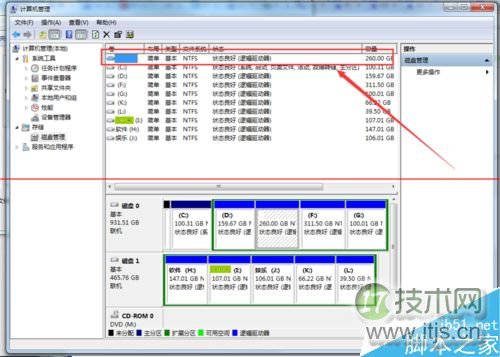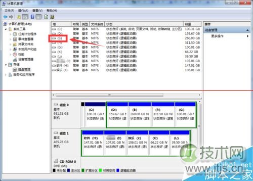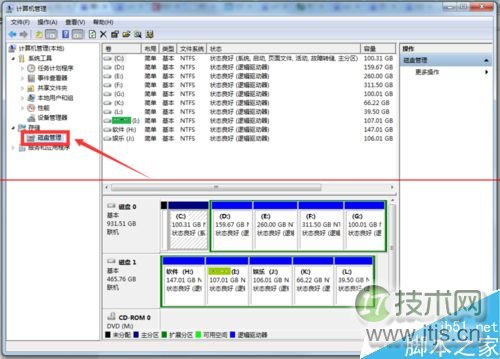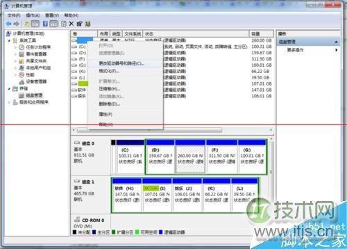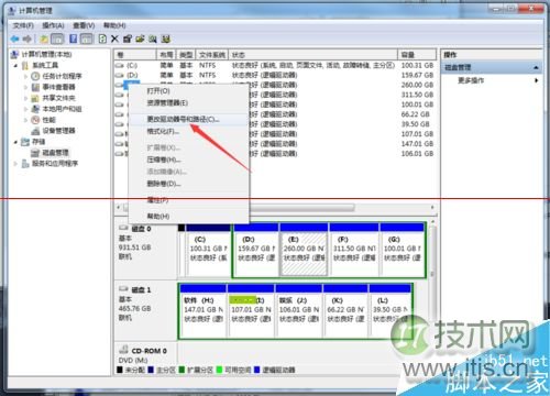 3、进入计算机管理界面我,我们找到【磁盘管理】,在被Windows 7识别为系统盘的盘符下【右键】→【更改驱动号和路径】
