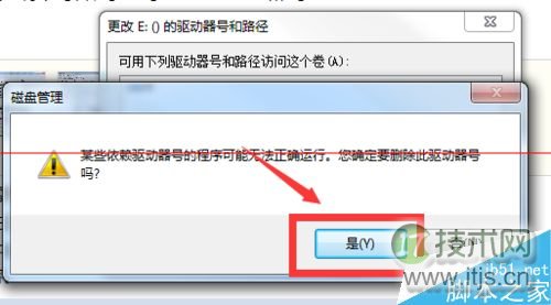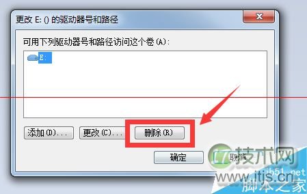 4、你需要先记住你这个盘的代号,是D盘呢还是E盘。以备等下的显示。记住后我们就可以点击【删除】了。你不用担心,这里删除只是把这个盘的盘代号给删掉~完完全全不会影响盘里的内容。