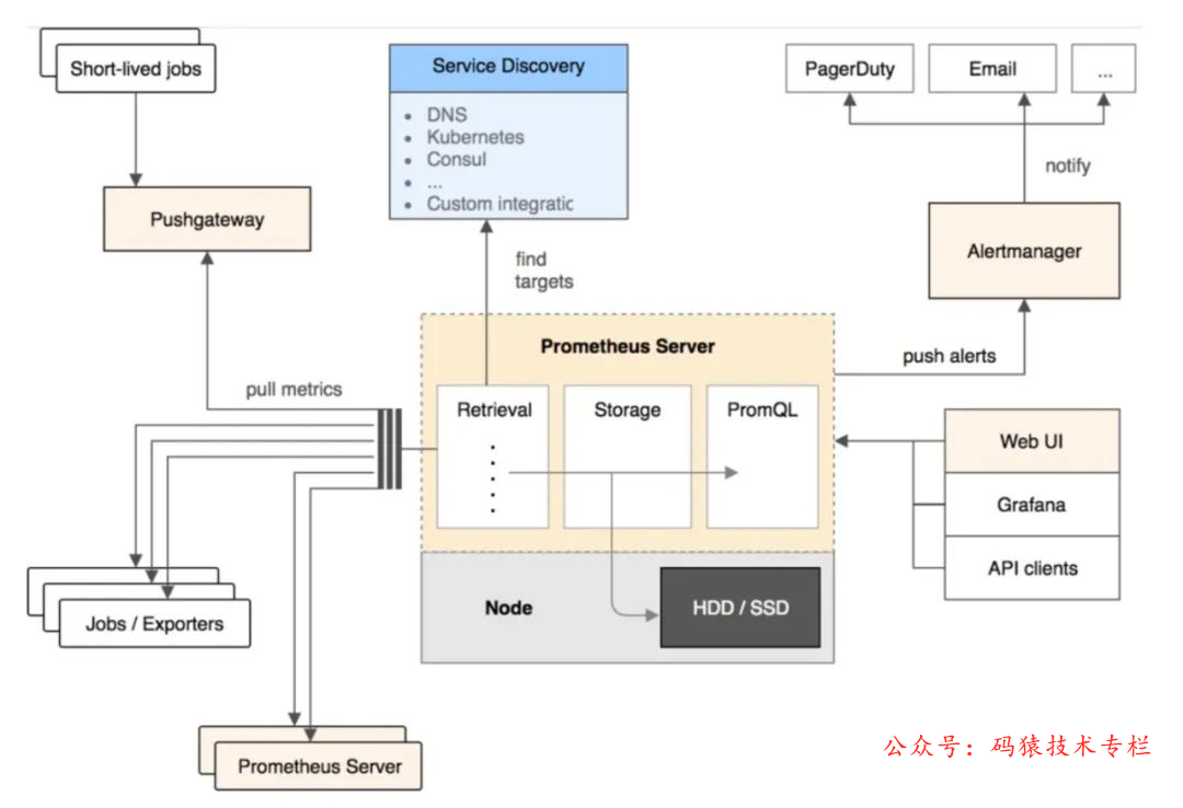 架构看去比Zabbix复杂多了,其实它也是基于Server---Agent的模式,只不过Server又给他划分了好几个组件,这个耦合性和扩展性都得到了明显提高。