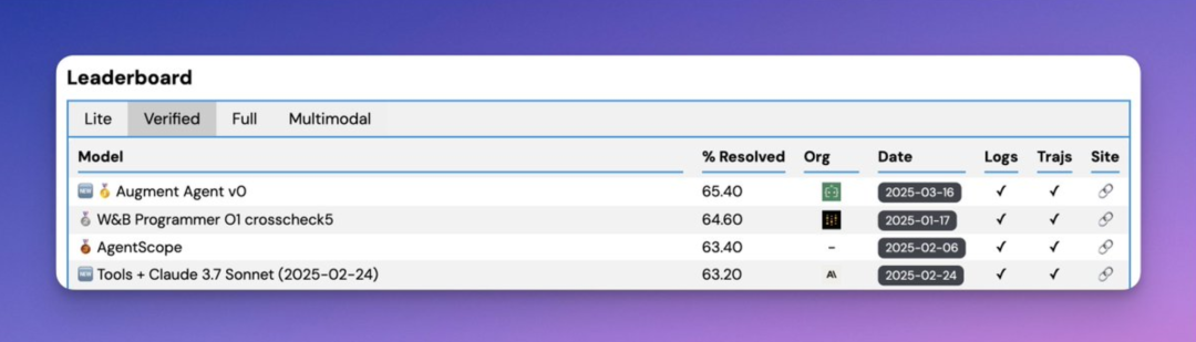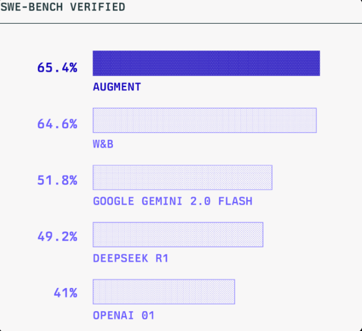 SWE-bench Verified 排行榜上,结合 Claude Sonnet 3.7 和 o1,Augment Agent 以65.4%的成绩拿了第一。
