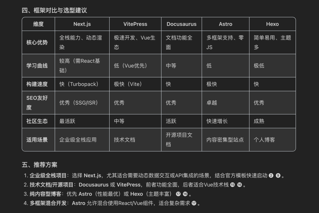 我想使用它来氛围编码一下。我用Deepseek比较了一下开源文档框架: