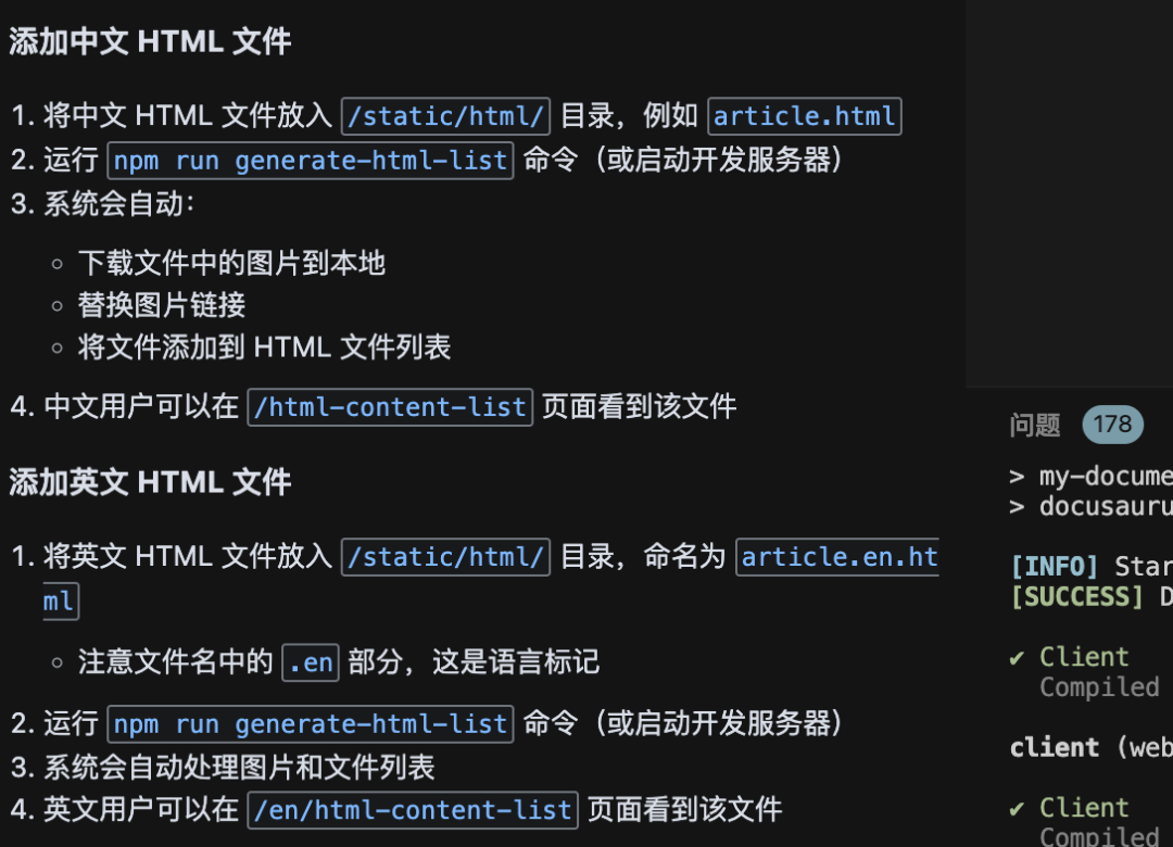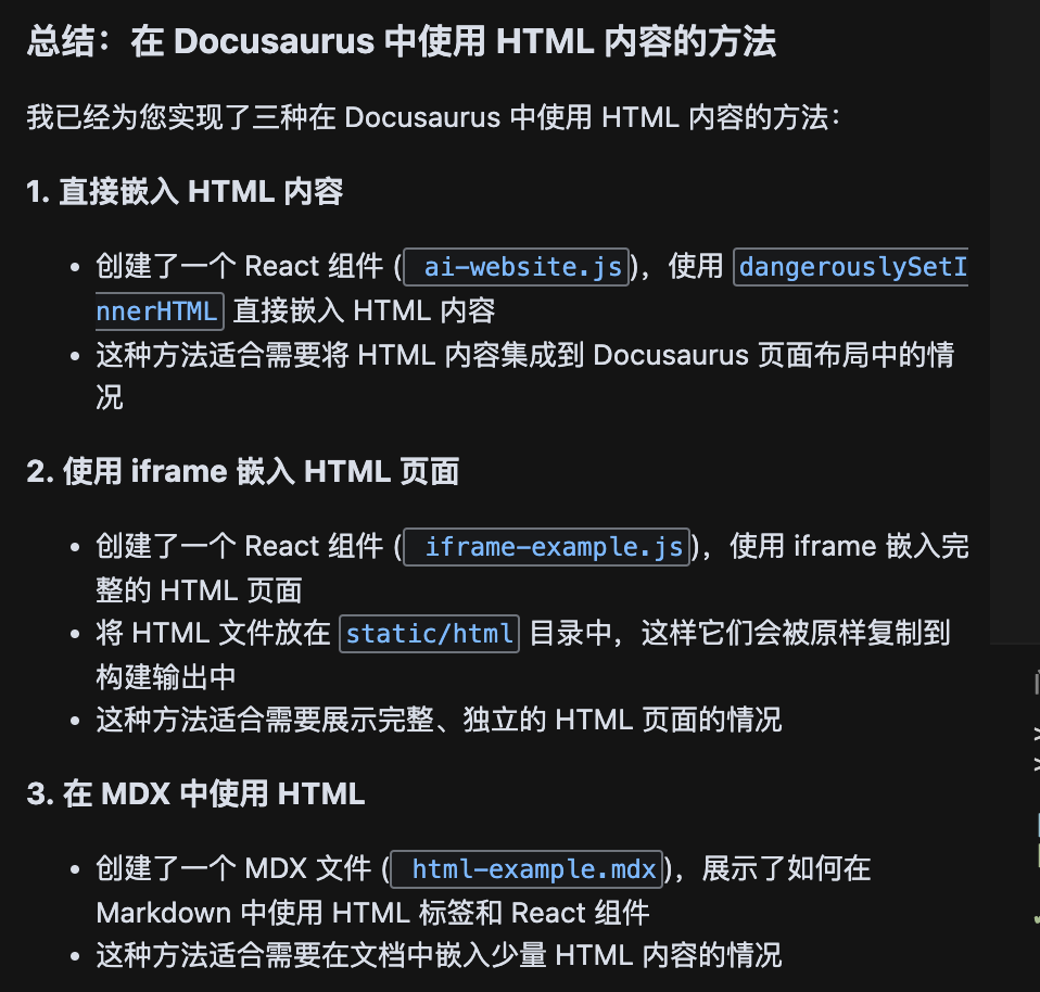 我告诉他我希望能够将已有的公众号文章 HTML 文档直接加载到 Docusaurus 网站中。