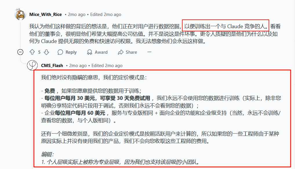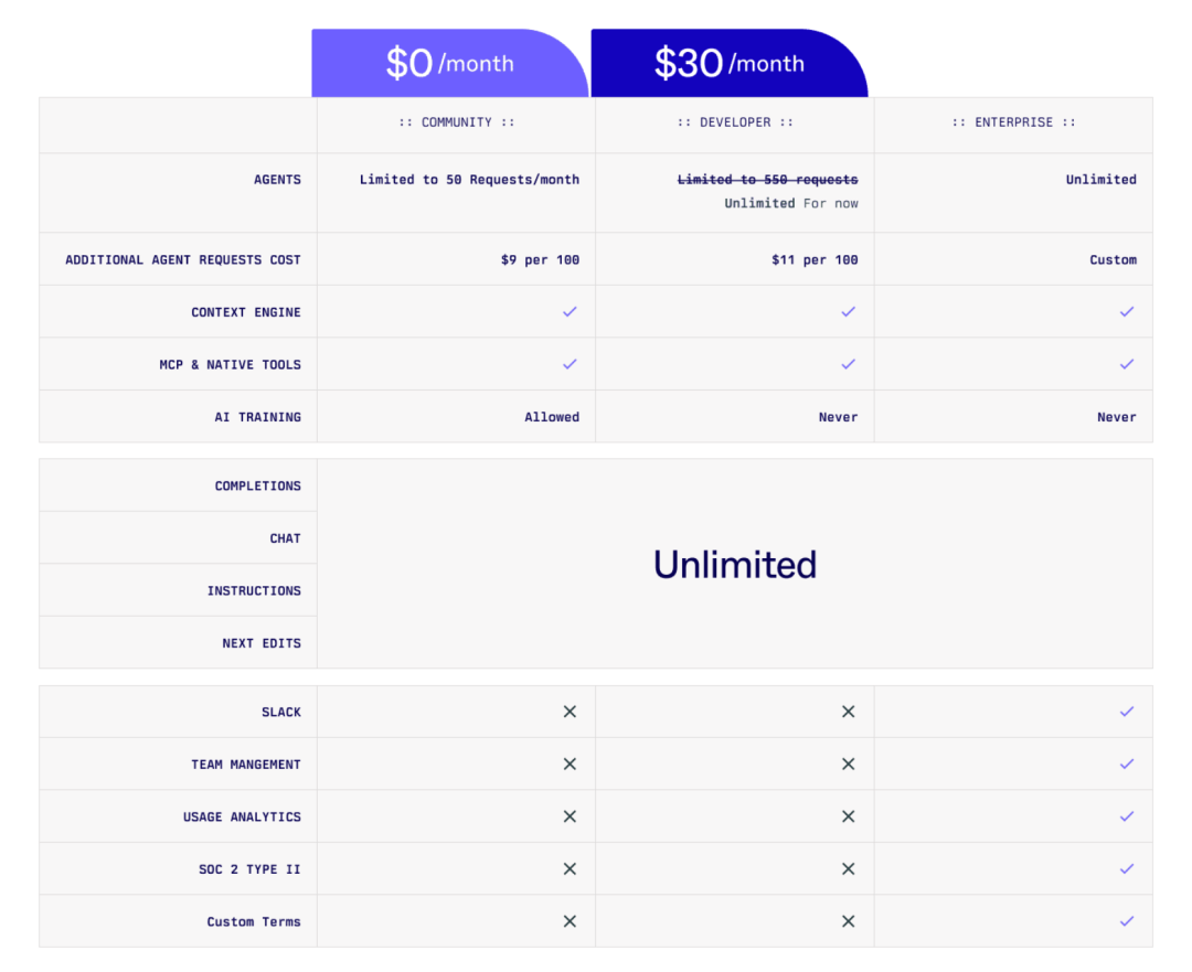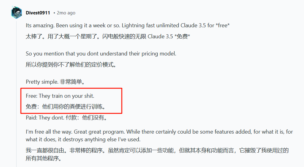 当然Augment Code 现在免费无限制使用——Claude3.7 + o1 以及它的其他微调模型组成的Augment Agent,但免费层的代码是会被训练的,付费层不会: