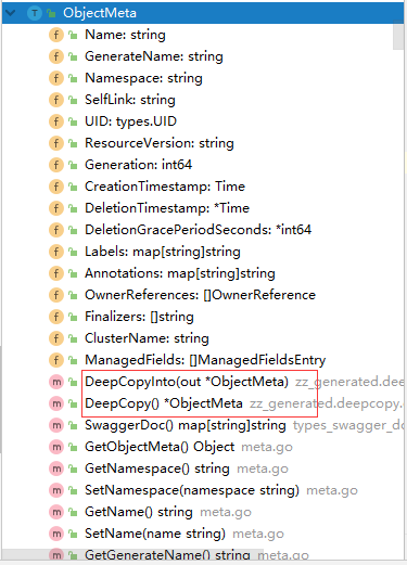 那么我们复制一个 Deployment 为 StateDeployment,注意,因为 Deployment 的两个属性, metav1.TypeMeta 和 metav1.ObjectMeta 分别实现了不同的方法,如图所示