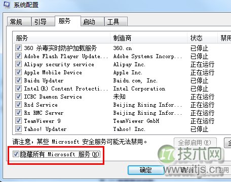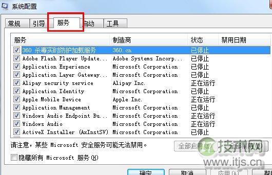 第二步,我们将界面切换到服务选项,然后将下方的隐藏所有microsoft选项勾选上。现在上面的窗口中出现的服务就是真实的网站模板电脑中第三方加载项的全部服务项目了,大家可以看看,哪些是不需要的,就将它删除好了。