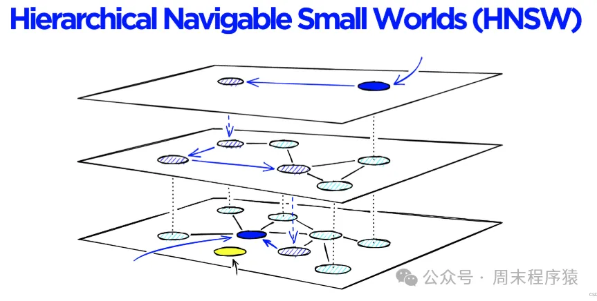 HNSW 是一种基于图的搜索方法,使用图结构来存储向量,然后通过图的搜索来找到最相似的向量,原理类似跳跃表,通过分层的 k-ANN 图来实现递归搜索。