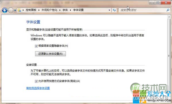 首先,在刚才的界面上点击“字体设置”,进入字体设置界面,勾选“允许使用快捷方式安装字体(高级)(A)”。