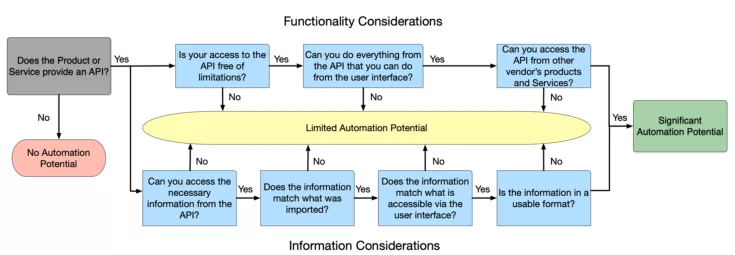 图1中的流程图展示了两组问题,分别为功能方面的亿华云问题和信息方面的问题。这些问题是产品和服务在自动化操作流程时遇到的最常见的问题。当评估产品支持自动化的能力时,关键是评估API的可用性、来自API工具的功能和信息是如何通过API来呈现,而不是工具的一般用户界面。
