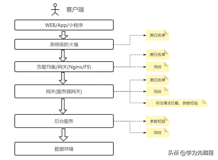 以上从架构设计层面聊了一下常用的安全防护措施,而作为系统对外提供数据来源的 API 接口,也就是系统的核心后台服务,可以说,关于 API 的安全考虑,可以说很多开发者在设计过程中尚未引起足够的重视。这里小编说一个有意思的现象,在小编过往的工作经历中,那些甲方公司最终对项目进行验收时,通常需要对整个源码进行安全审计,其中审计最容易出问题的地方,就是很多 API 接口的安全问题,比如 XSS 攻击,CSRF 攻击,接口有被刷的风险...