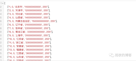 复制# -*- coding: utf-8 -*-# !/usr/bin/python3# desc by: 两行代码实现SQL文件中数据提取,后期可以结合geogle浏览器插件应用# author by : rainNight# weChatPublicNumber: 雨夜的博客import reimport json"""第一步:读取area.sql文件,去除多余内容提取需要添加的数据第二步:定义转换后的文件地址,写入文件"""opens = open("./data/area.sql", encoding="utf-8")
