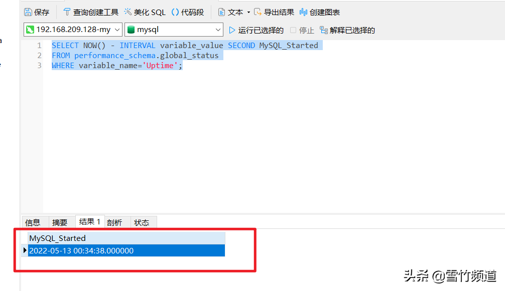 复制SELECT NOW() - INTERVAL variable_value SECOND MySQL_StartedFROM performance_schema.global_statusWHERE variable_name=Uptime;1.2.3.