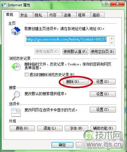 第四步:在“Internet属性”界面中,找到“浏览历史记录”,服务器托管并点击“删除”按钮。