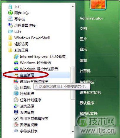 第一步:单击“开始”界面中,找到“所有程序”中“附件”中“系统工具”里的“磁盘清理”。