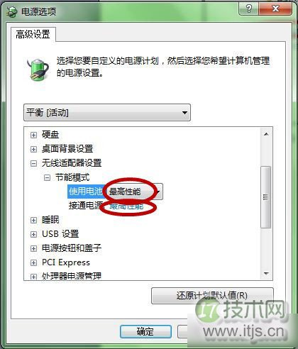 第四步:展开“无线适配器设置”点击“节能模式”,将设置更改为“最高性能”。