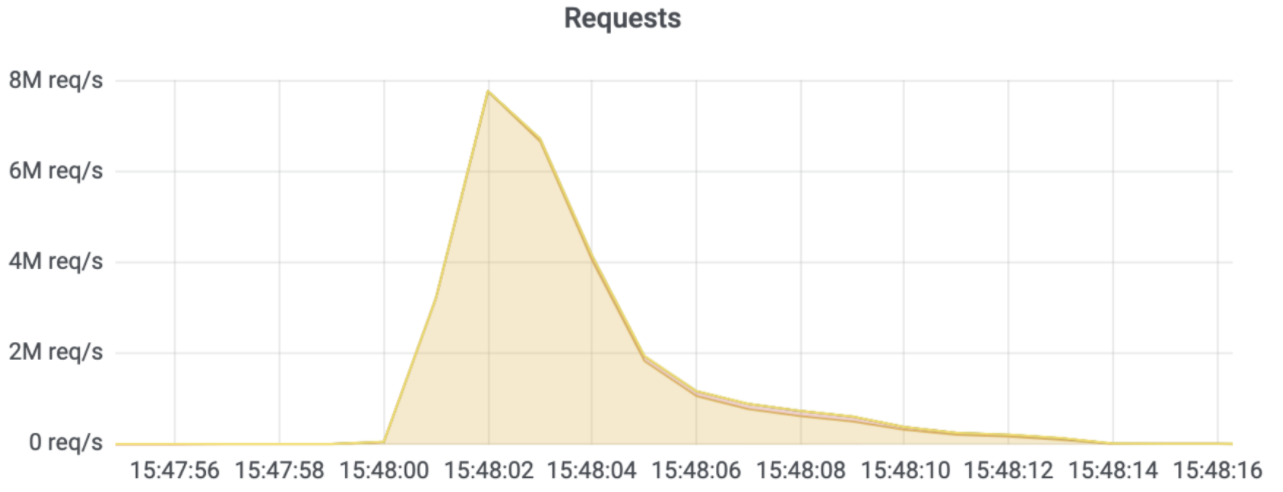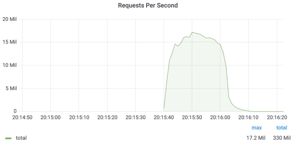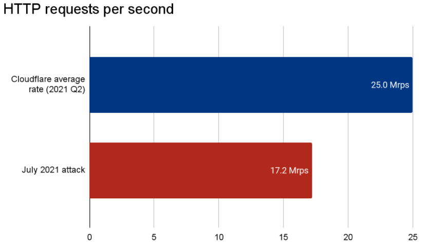 17.2 M rps的攻击流量是 Cloudflare拦截的最大规模HTTP DDoS攻击流量,是之前报告的HTTP DDoS攻击流量的3倍。是几周前发现的HTTP DDoS攻击流量8 Mrps的近1倍。