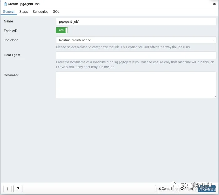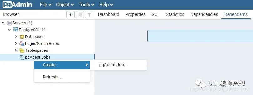 右键点击“pgAgent Jobs”节点,选择“Create” > “pgAgent Job”创建一个新的定时任务。