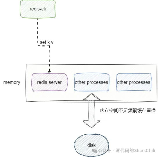 需要补充的是,上面提到日志重写期间数据都会被写到AOF缓冲区中,在高并发场景下也可能导致内存被打满出现频繁内存置换等情况间接导致我们的redis进程阻塞,此时就可能出现读写性能下降的情况: