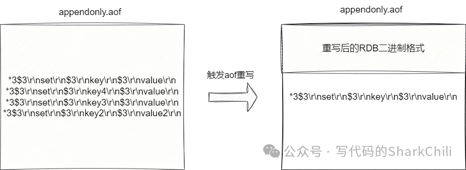 初始状态下,写入的指令都会以AOF格式写入aof文件中。当发生AOF重写时(bgrewriteaof ),redis会fork出一个子进程,进行aof重写。redis将重写的数据以rdb的数据写到新的aof文件中。随后再将aof缓冲区的增量命令(aof_rewrite_buf_blocks)写到新的aof文件中。完成上述操作后我们就会得到一个前半部分是RDB后半部分是AOF的aof日志文件。最后将新的aof文件替换掉旧的rdb和aof文件。