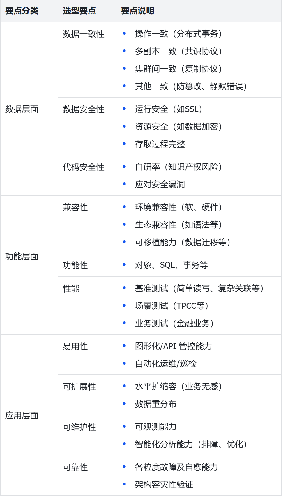 数据库选型涉及到方方面面,因素是比较多的。特别是针对分布式数据库,因其架构较传统架构有着较大差异,因此在选型过程中更应全面考虑。之前个人也整理过脑图及超过数百页的选型文档,可以说是较为繁琐的工作。这也是妨碍很多用户选择使用国产数据库的难点之一,很少有用户有足够的技术储备、宽裕的精力去完成这一工作;而更多的只能听取来自乙方厂商的宣传。这也为后续的替换工作埋下了一些隐患,笔者也听说有国内用户做完数据库替换改造不久之后,又启动新的替换工作,相信这是无奈之举,但也造成了很大的资源浪费及不必要的网站模板风险。下面则是书中给出的一些选型要点