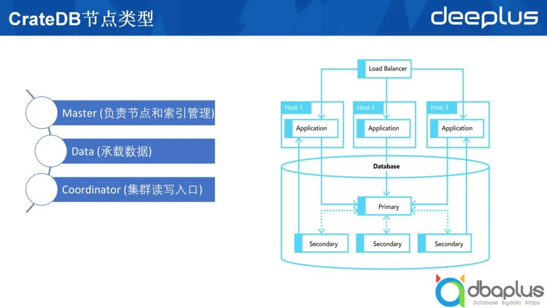 上图右半部分所示为在生产上部署一个CrateDB或ElasticSearch集群。最上方的负载均衡部分可有可无。除上文提到的两种节点类型外,还有一种叫做Coordinator的节点类型,它既不承载具体的数据,也不扮演Master的角色,只接受外部的请求,并将外部请求路由到数据节点上做具体查询,然后在Coordinator节点做一些汇总,最后返回给应用程序。除此之外,ElasticSearch中可能还会有一个叫Ingest的节点类型,这里不进行过多阐述。