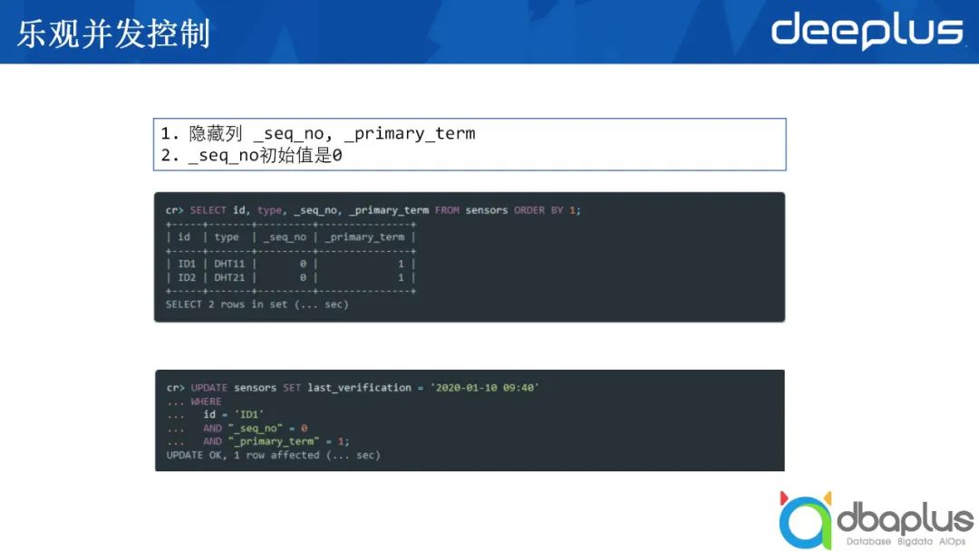 2)乐观并发控制CrateDB是基于ElasticSearch的数据库,其在ElasticSearch基础上进行了叫做乐观并发控制的演变。我们将数据写入到某一张表时,有两个隐藏的列,一个是sequence_number,即这一列的版本号,另一个为primary_term,二者联合使用可以实现某一版本的数据只更新一次,避免频繁更新。