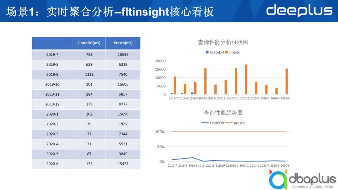 上图是我们使用CrateDB之后进行的比较,图中只比较了CrateDB和Presto,我们当时的场景如下。