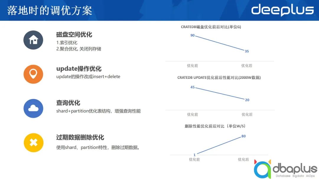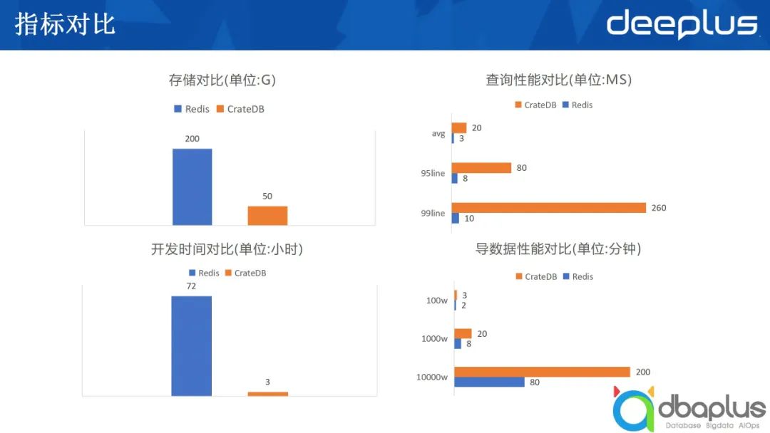 我们有不少的表,每张表的数据量都有几千万条,有的甚至上亿条,需要对数据做比较复杂的聚合。原来是用Presto查询,因为它是一个看板,每次刷新的间隔延迟较大,为了解决这个问题,我们尝试了一些方法,后来发现用CrateDB效果较好,右侧是性能对比,收益十分明显。