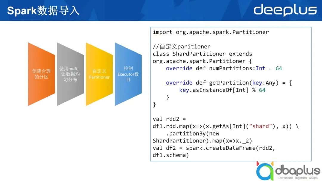 这样做的挑战是在写Spark程序时,怎样让每一个partition当中的数据都是落入同一个分片的内容,大家可能会想到repartition函数,但repetition是对某个字段进行哈希,并不能保证落到同一个 partition的数据,这时我们就需要去制定 partition。上图右侧写出了一些伪码,我们在spark中定义一个repartition,然后重载,显示这里可能会有多少个不同的分片。